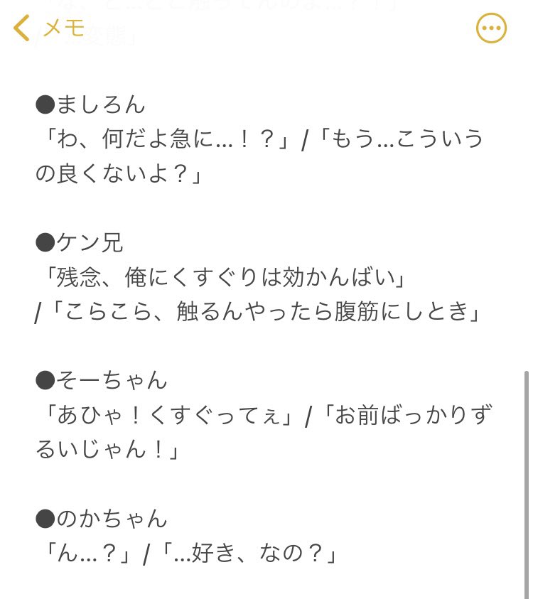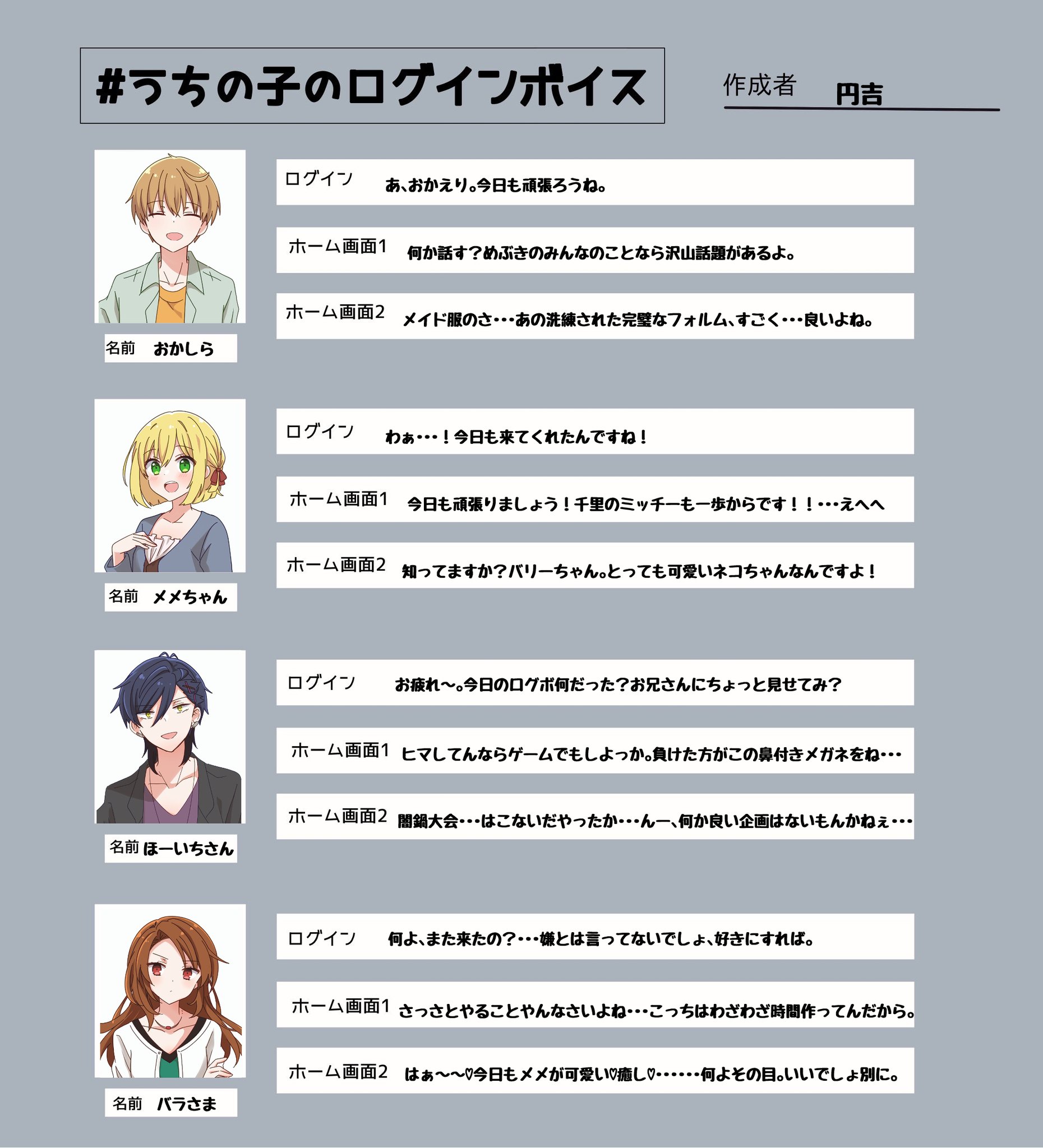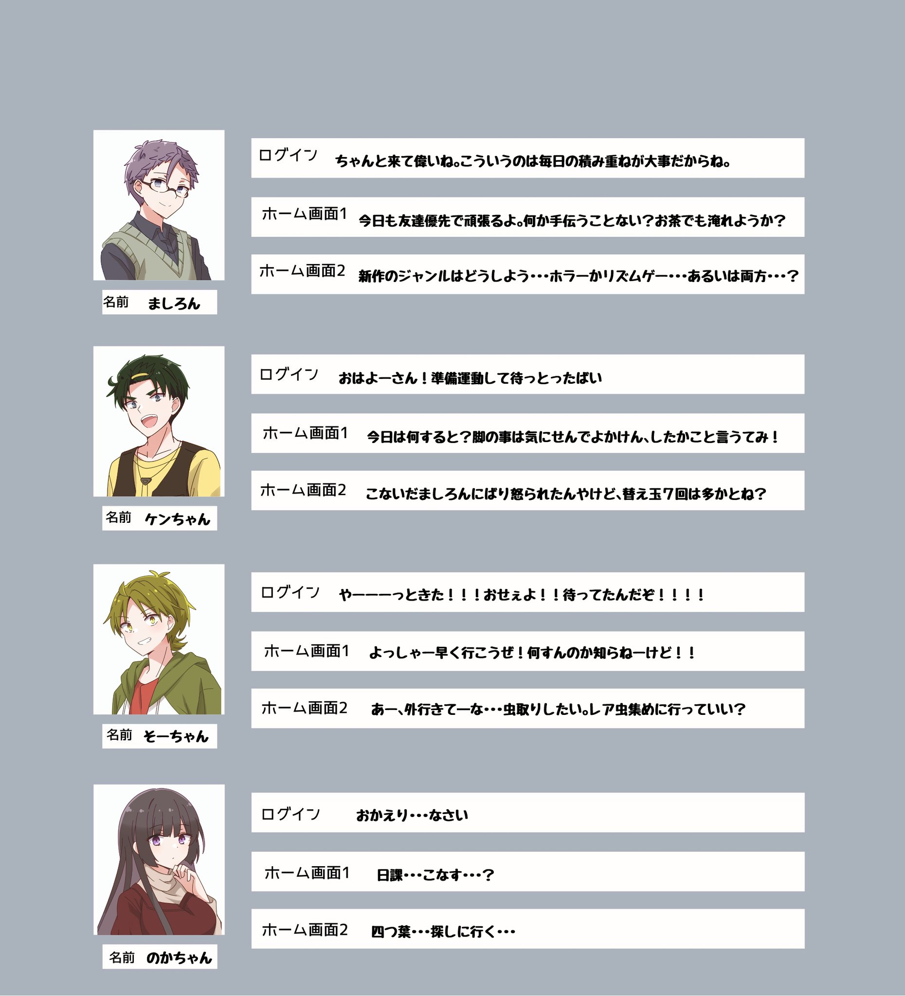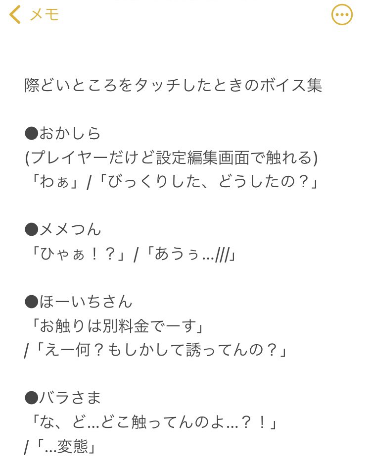 昔テンプレ借りてログインボイス妄想してたんだけど、「ホーム画面に設定して際どいところをタップした時のセリフもいるよね??」と思って考えてたやつもあったんですよね。#ソシャミラ